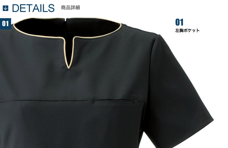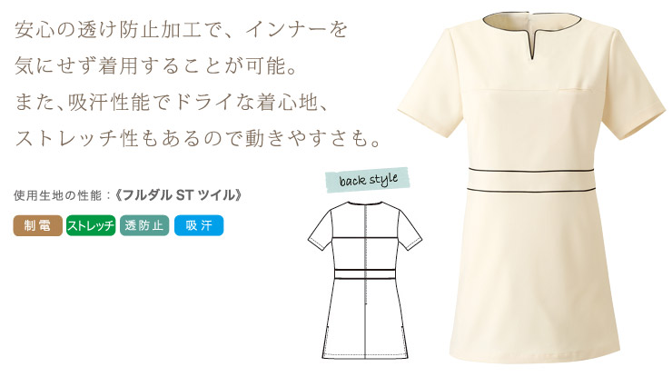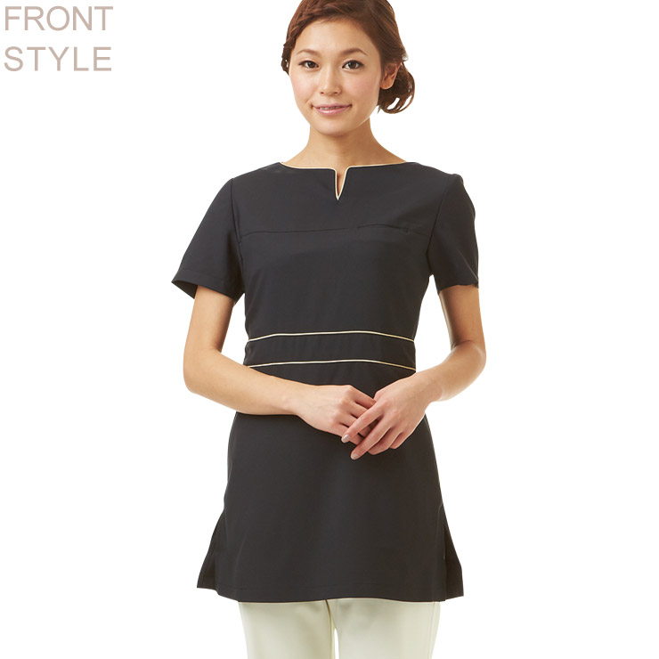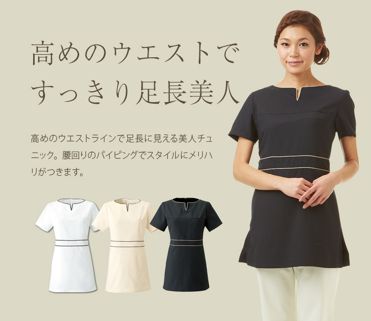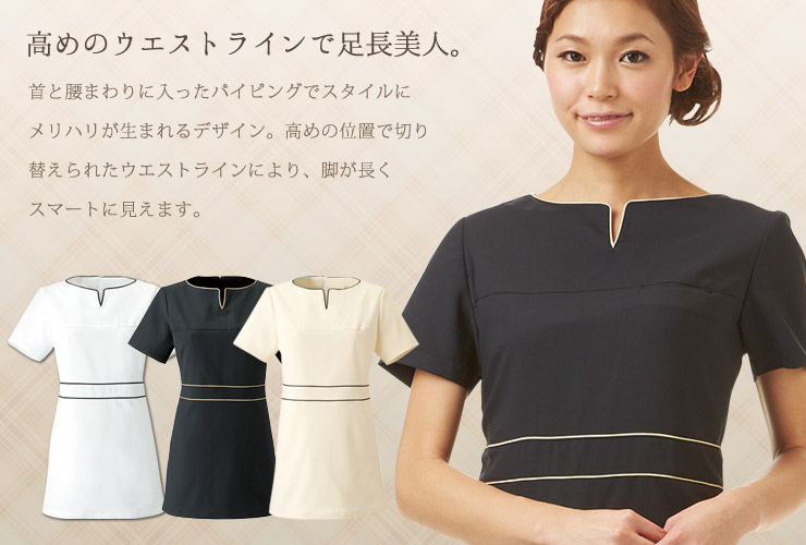 高めのウエストラインで足長効果のあるチュニック。 首と腰まわりに入ったパイピングでスタイルにメリハリが生まれるデザイン。 下着の透け防止や、汗のにじみ、静電気を防ぐ高機能素材を採用。