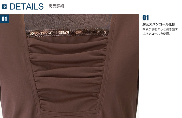 ギャザーを寄せ、スパンコールを施した胸元のデザインは女性の華やかさを引き出します。
