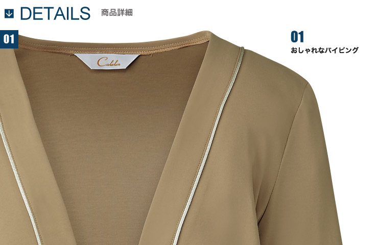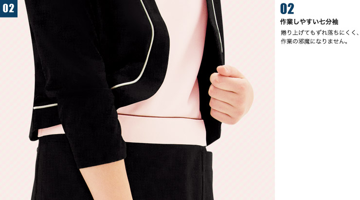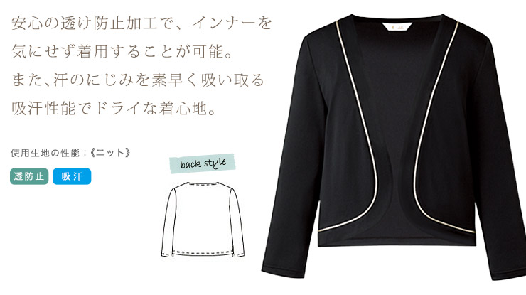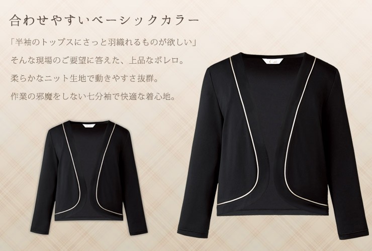 「半袖のトップスにさっと羽織れるものが欲しい」。そんな現場のご要望に応えた上品なボレロ。 柔らかなニット生地で動きやすさ抜群。作業の邪魔をしない七分袖で快適な着心地