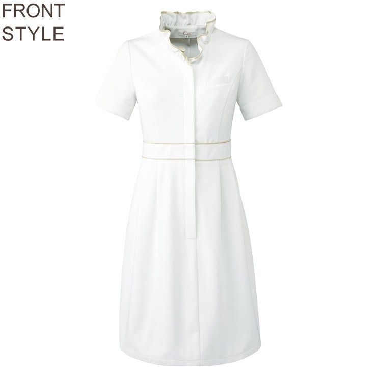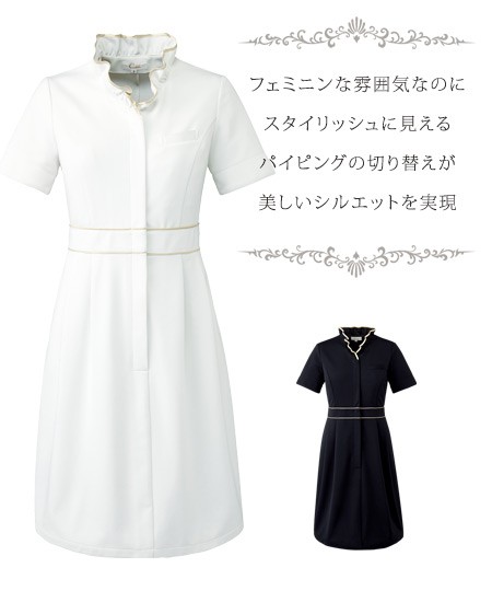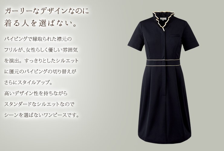 胸元のパイピングが施されたフリルがフェミニンなデザインのワンピース。