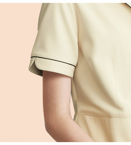 モードな中に女性らしさがある大人の女性にぴったりのワンピース。 ジャケットのような襟元とおしゃれなパイピング使いで、スタイリッシュでかっこいい大人の女性を演出。 着脱簡単なフロントファスナー、胸元の開きを防止するスナップボタンなど、着やすさにもこだわったワンピース。 透け防止・制電・ストレッチの高機能素材で快適な着心地です。