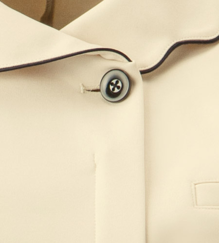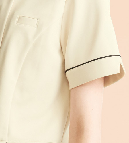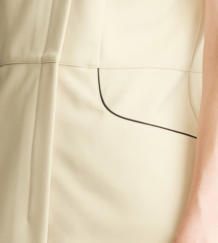 きちんと感のあるデザインが大人の女性を演出する曲線美チュニック。花びらを想像させる襟元や脚長効果のあるハイウエストの切り返しが女性の魅力を引き出します。着脱簡単なフロントファスナー、大容量の両脇ポケット、動きをスムーズにする袖口スリットなど、着やすさにもこだわったチュニック。透け防止・制電・ストレッチの高機能素材で快適な着心地です。