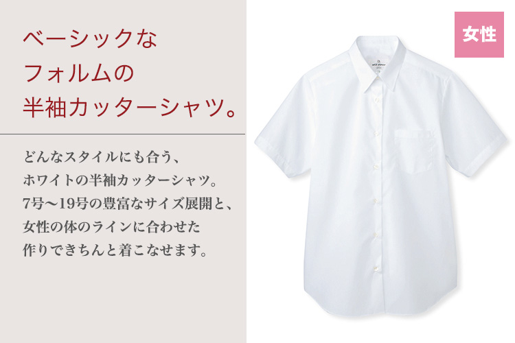 豊富なサイズ展開のベーシックな半袖シャツ。女性用のため体のラインを意識したつくりです。