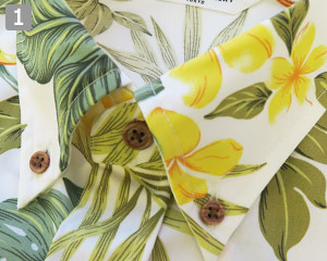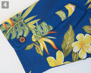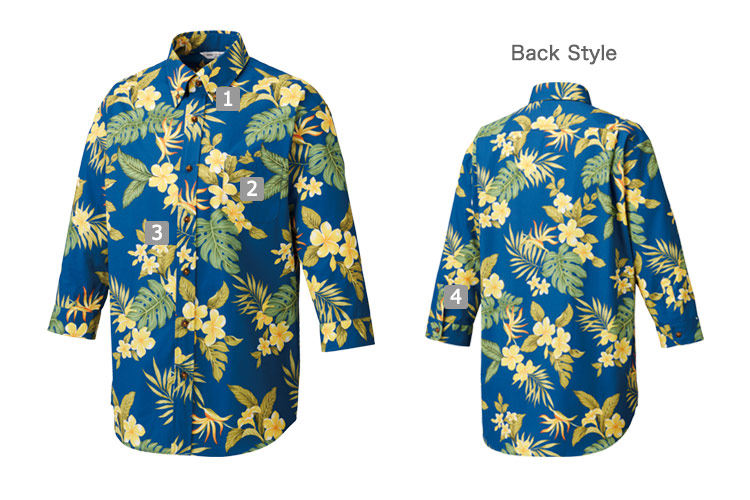 襟元はボタンダウン仕様になっているため、ラフすぎずきちんとした印象を与えます。また、アロハシャツには珍しい七分袖仕様で、肌を露出しすぎず、作業性も損なわない!