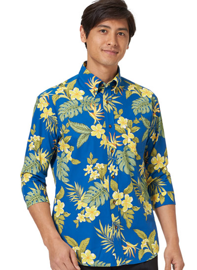 華やかな花柄の七分袖アロハシャツ。原色カラーにイエローとグリーンの柄配色で元気な印象を与えます。きちんと感のあるボタンダウン襟仕様です。