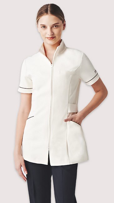やさしい肌ざわりと、ストレッチ性のある生地「ストレッチラチネ」を使用したミシェルクランのチュニック。 工業洗濯にも対応しており、制菌、制電加工とアンダーウエアが透けにくい加工も施されています。 フロントファスナーで脱ぎ着がしやすいデザインです。
