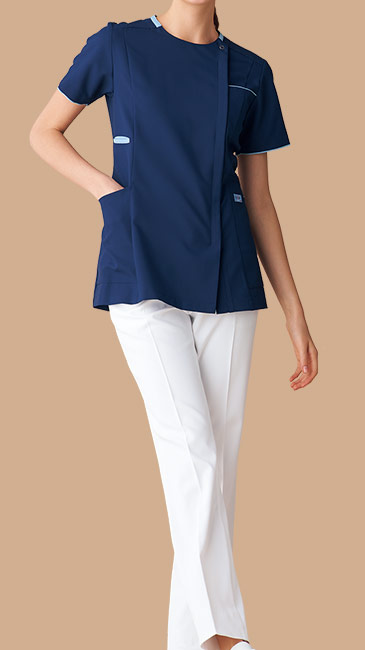 サラッと軽い着心地で、制電・透け防止機能に加え、SEK認証の制菌加工で、常に清潔な状態を保てます。工業洗濯対応で劣化しにくい生地。