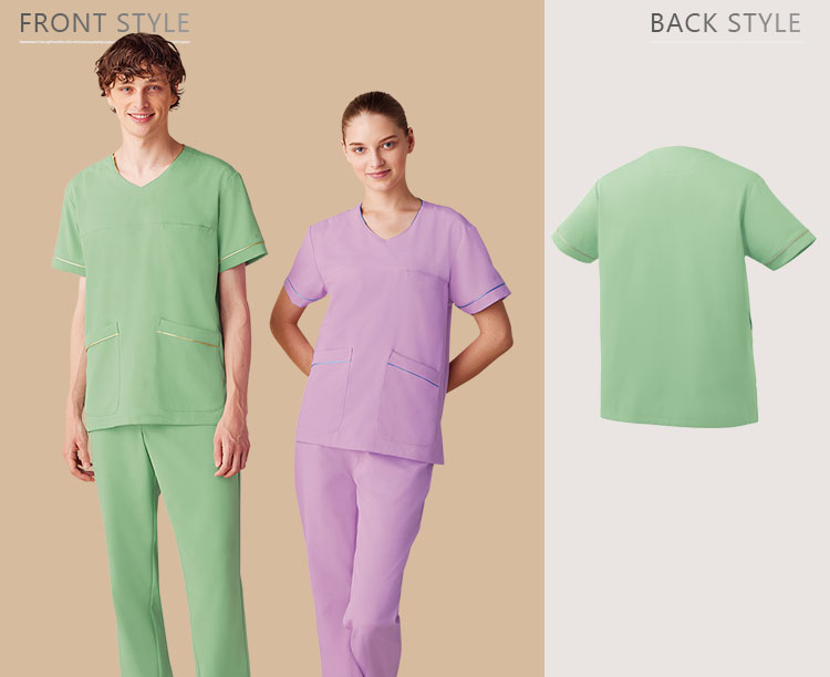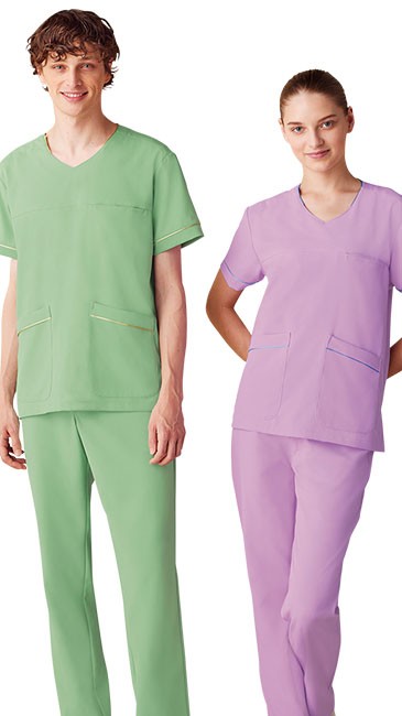 人気のミッシェルクランから、パステルカラーが新鮮な、やわらかい印象で気持ちが明るくなるスクラブが登場。パイピングがアクセント、ストレッチ性も高く動きやすい。