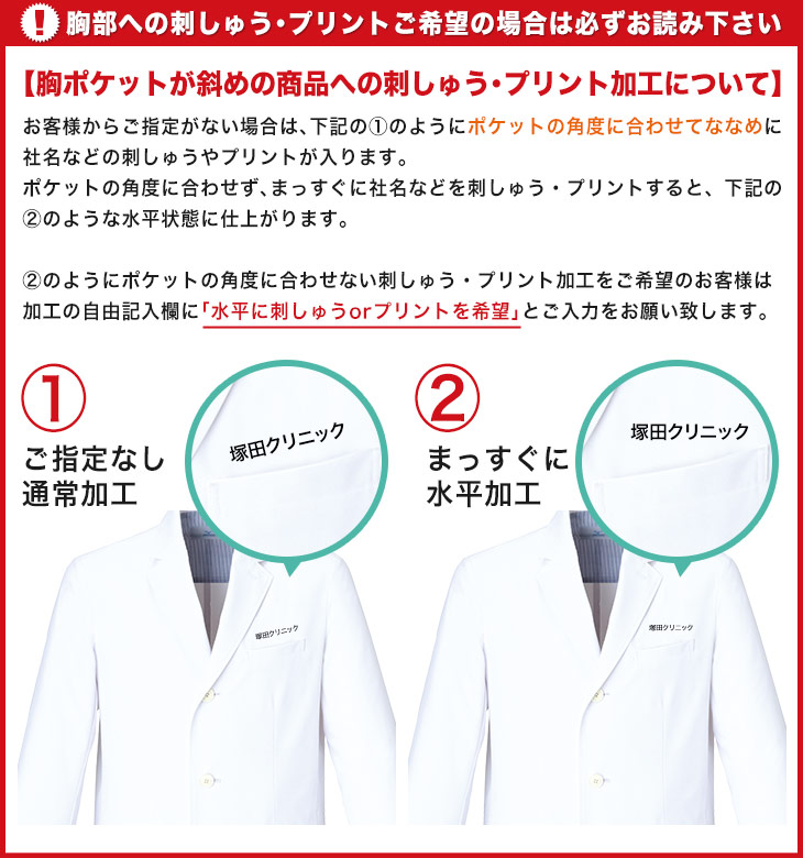 主に良質なスーツやジャケットに用いられる、飾り刺しゅうの仕様です。 ドクターコートに品格を添え、正面からの印象を格上げします。
