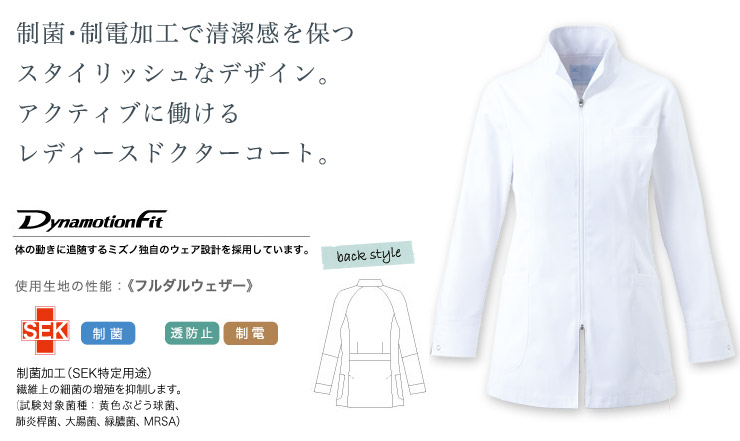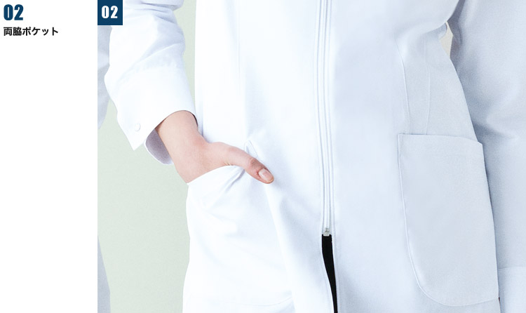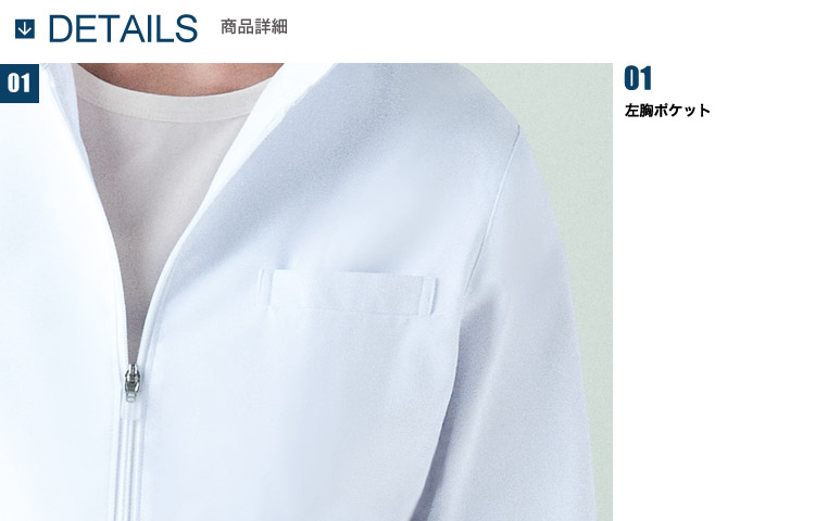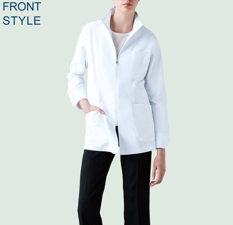 前開きジッパーでスピーディーな着脱が可能なハーフコート。 アクティブに動けるスタイリッシュなデザインが特徴です。 制菌・制電加工で細菌やほこりなどから衣服を守り、常に清潔な状態をキープします。