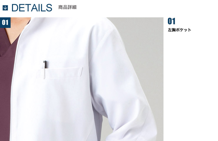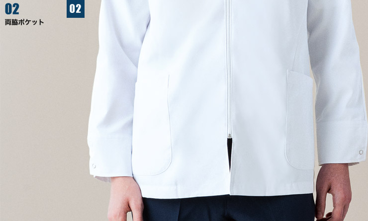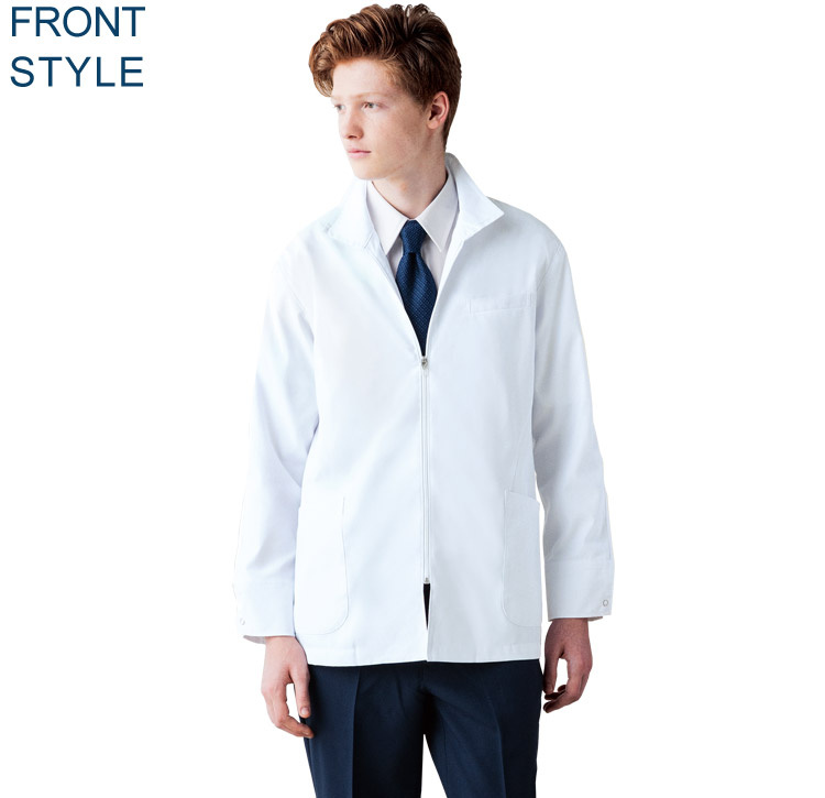 前開きジッパーでスピーディーな着脱が可能な男性用ハーフコート。 スタイリッシュなデザインが特徴です。 制菌・制電加工で細菌やほこりなどから衣服を守り、常に清潔な状態をキープします。