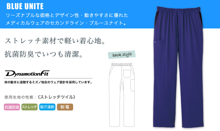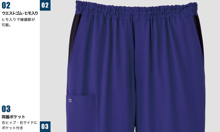 - Dynamotion Fit、股下マチ付、ウエストゴム・ヒモ入り、両脇ポケット、右ヒップポケット、右サイドポケット