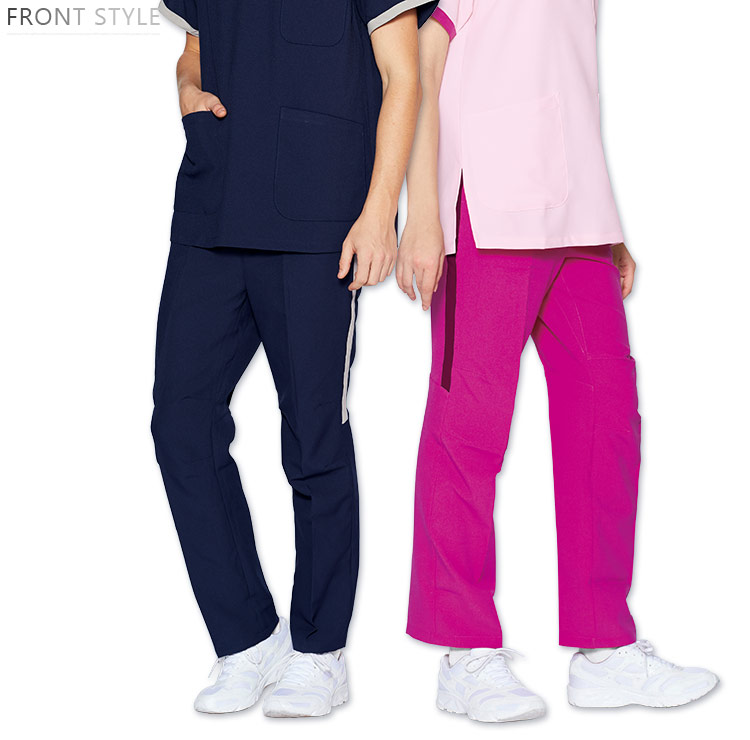 - 股下マチ付、ウエストゴム・ひも入り、脇ポケット、前ファスナー付き、左右ヒップポケット