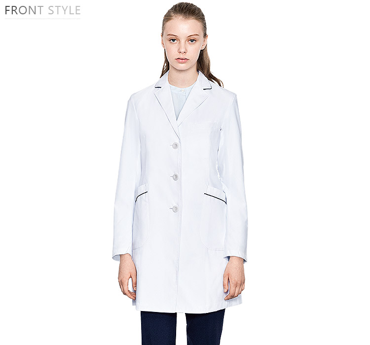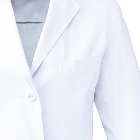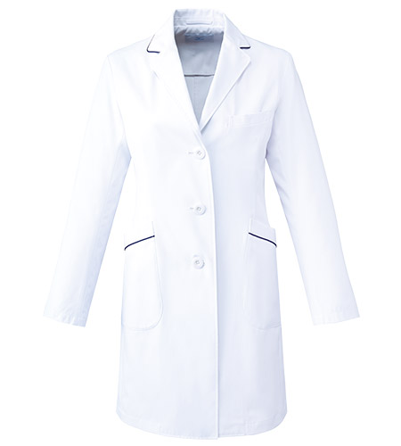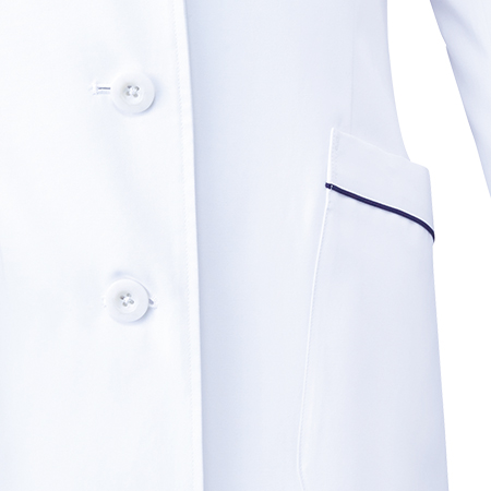 Mizunoのスタイリッシュなレディースドクターコート。襟とポケットのアクセントカラーがおしゃれ!菌の繁殖を抑え、長く清潔な状態を保つ制菌加工で透けにくいのも嬉しい。
