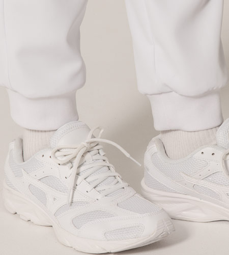 MIZUNOのスクラブジョガーパンツ。裾にリブがあるトレンドのスタイルを取り入れた白いパンツは、気になる透けも強力な透け防止機能でインナーに悩まない!股下マチで動きやすく、ストレスフリーな着心地。 膝下からふくらはぎにかけてキュッとしまったシルエットで、すっきり着こなせます。