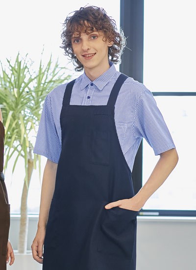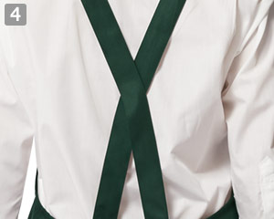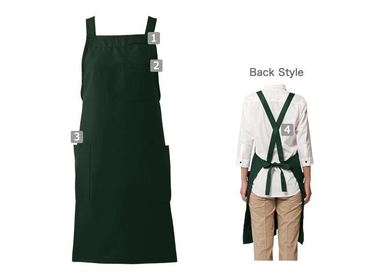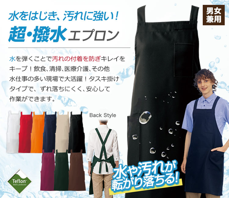 優れた撥水性と防汚性を発揮するテフロン加工を施したたすき掛け胸当てエプロン。豊富な9色展開でコーディネートしやすい!