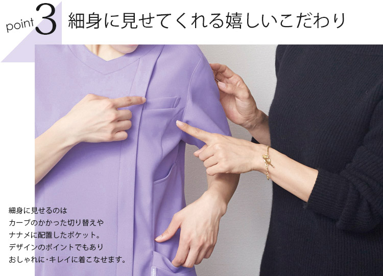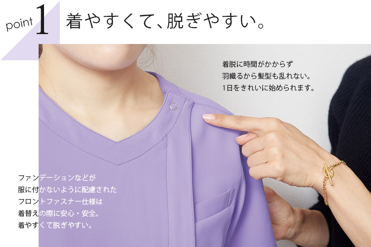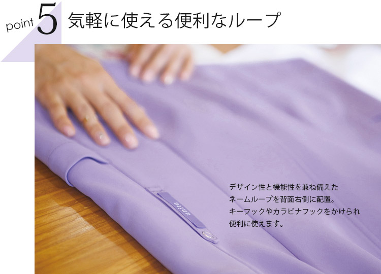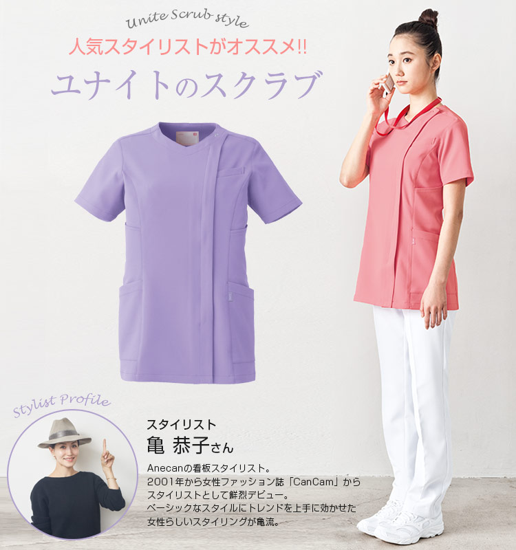 機能的で使いやすい、でもデザイン性にこだわったおしゃれな白衣。uniteオリジナルブランドシリーズが登場。 着脱しやすいフロントファスナー仕様のスクラブ!朝の準備もスピーディーに! 胸元が見えにくい浅めのVネックを採用し、着丈も長めだから、インナーが見える心配がなく、思い切り動けます! 人気スタイリスト・亀恭子さんのおすすめポイントも盛り沢山の、おしゃれに、機能にこだわった新時代の白衣です。