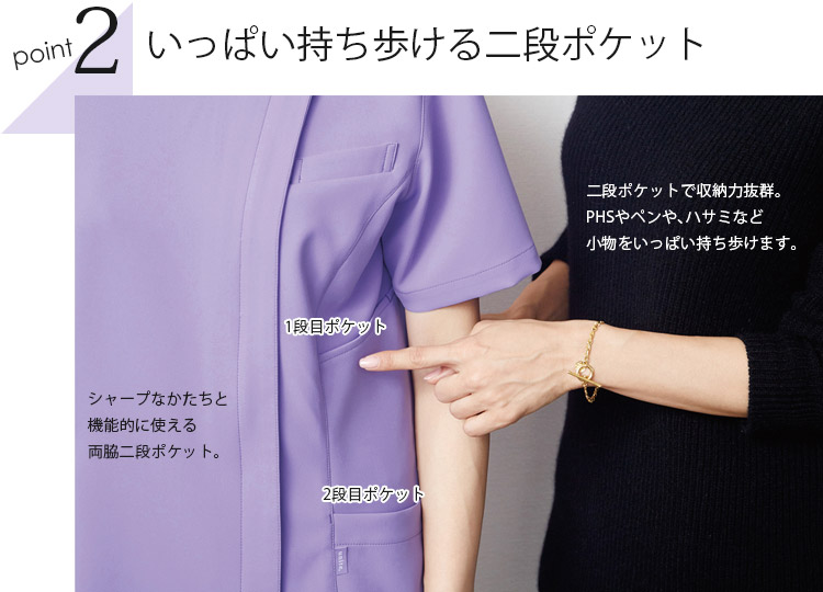- ストレッチ、工業洗濯対応、両脇二段ポケット、ネームループ付き