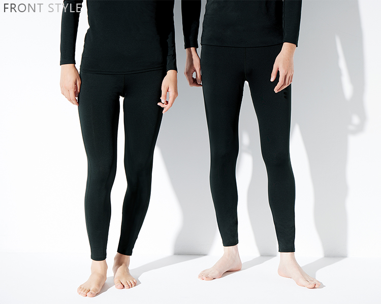 特殊セラミックの粉末が練りこまれた機能素材を使用。体から放射される遠赤外線を吸収し輻射することで保温効果を与えます。血行を促進し、疲労軽減をサポートします。軽くて薄く、ストレッチ性が高い上に、ウエストゴム仕様で着心地も快適です。