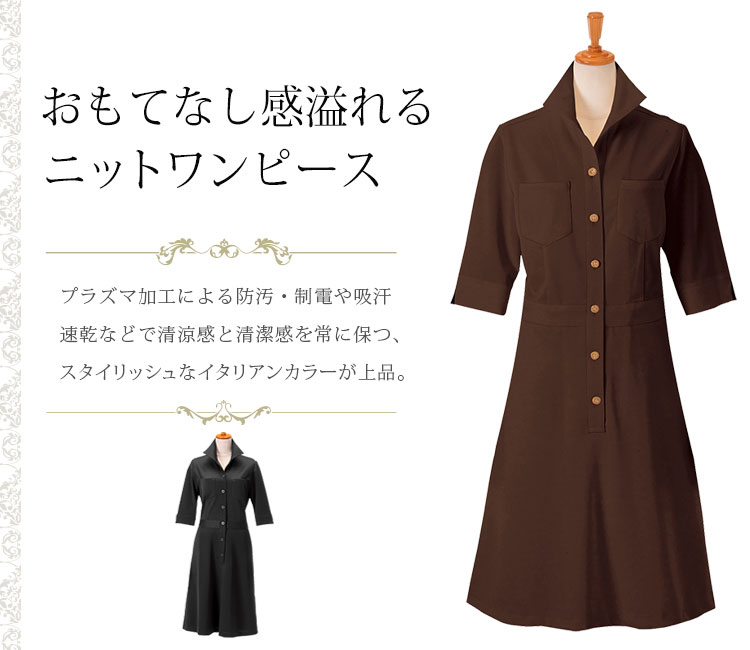 ボンユニのニットワンピース。ストレッチ・透け防止・吸汗速乾・防汚・制電と機能満載で、ラクなのにスタイルを美しく見せてくれるストレッチニットワッフルワンピース