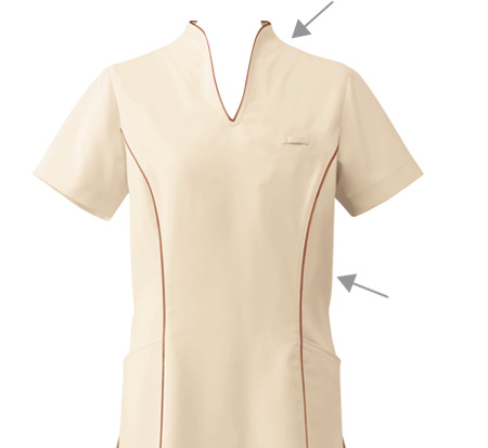 襟と両脇から腰にかけて走るパイピングラインがやさしさと洗練された印象を与えてくれます。斜めにカットされた両腰ポケット