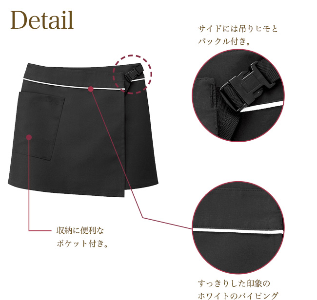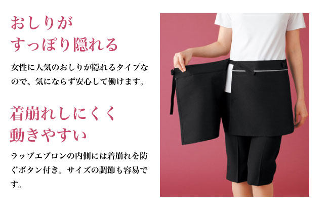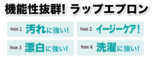 汚れに強い!洗濯に強い!漂白に強い!イージーケアラップエプロン。 エプロンの内側には着崩れを防ぐボタン付き。サイズの調節も容易です。