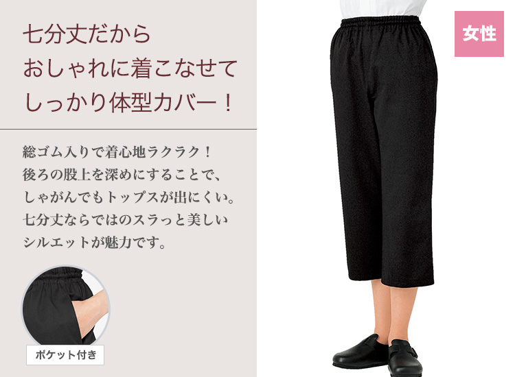 ボンユニのレディース七分丈パンツ。総ゴムで着心地ラクラク!後ろの股上を深めにすることで、しゃがんでもトップスが出にくいのも嬉しい!