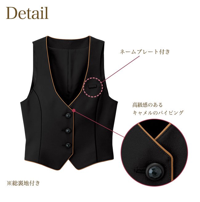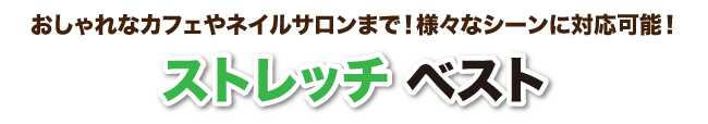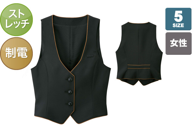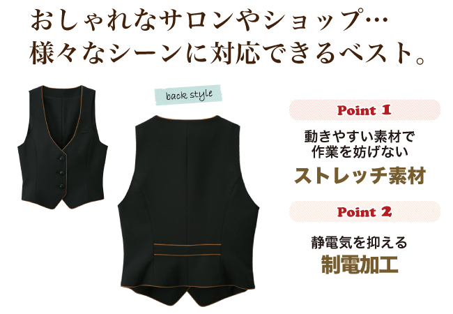 ボンユニのレディースベスト。作業を妨げない、動きやすいストレッチ素材!!制電効果で静電気を抑え、衣服のまとわりつきやほこりの吸着を防ぎます。
