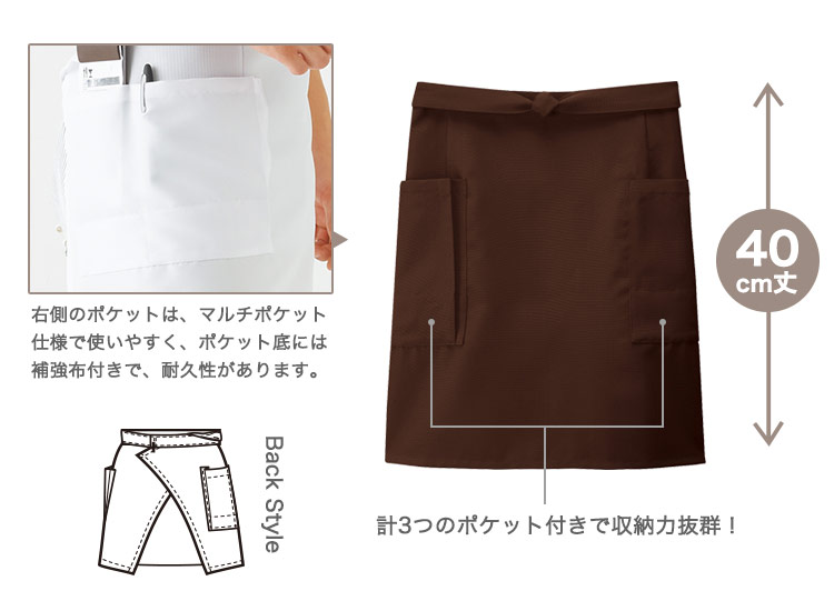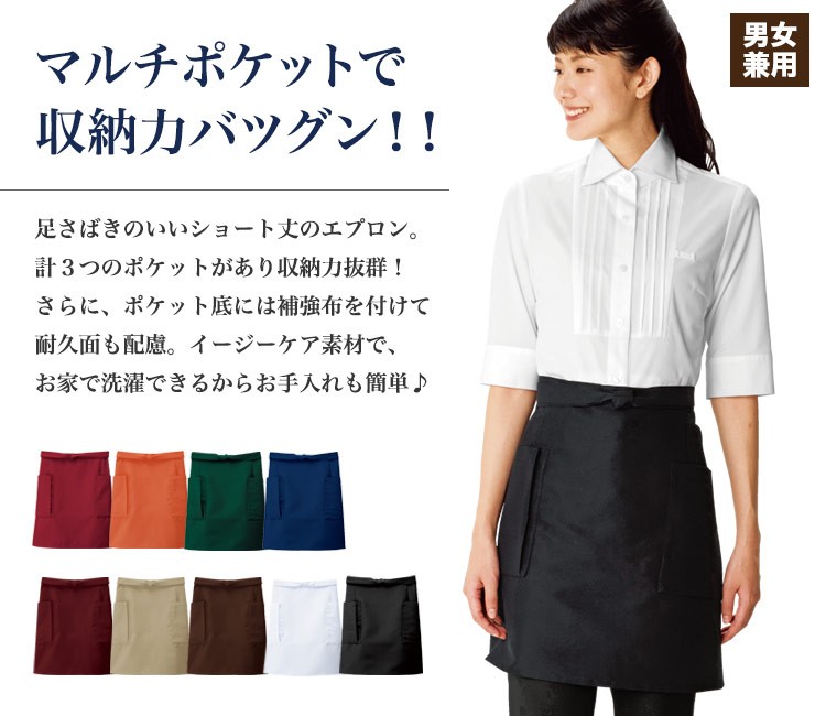 足さばきのいいショート丈の前掛け。計3つのポケット付きで収納力抜群!汚れ・洗濯・漂白・静電気に強い高機能でイージーケアな素材。 カラーバリエーションが豊富なので、色違いで揃えてもお洒落です。