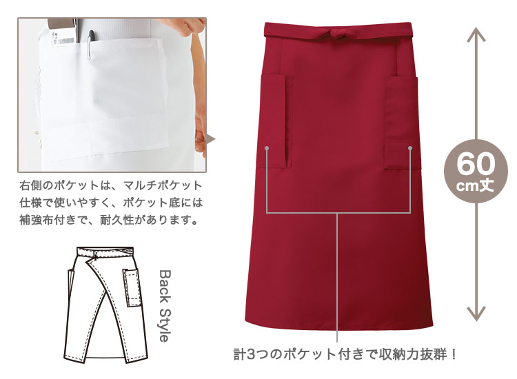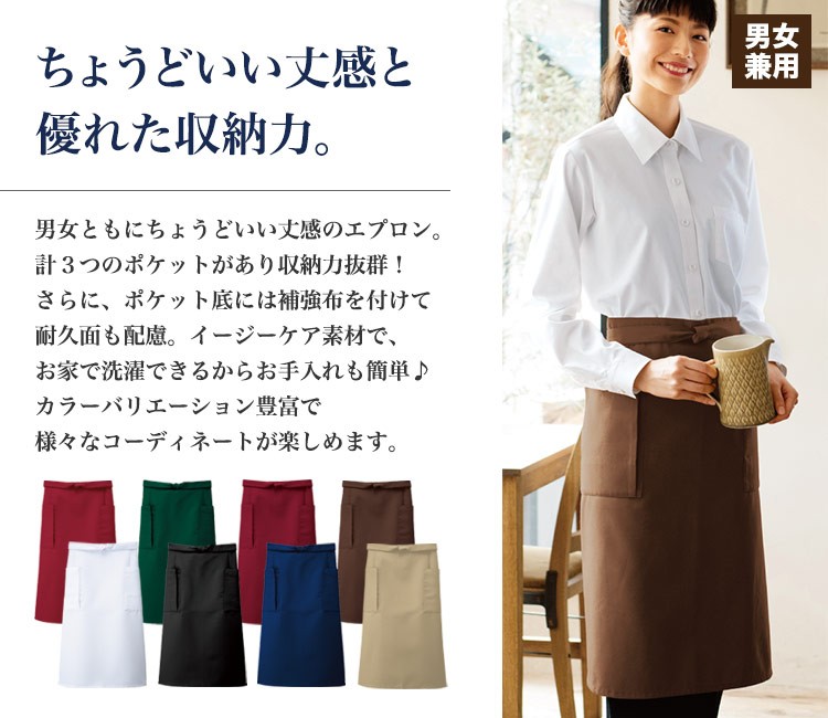 男性でも女性でもちょうどよく着こなせる丈のエプロン。計3つのポケット付きで収納力抜群!汚れ・洗濯・漂白・静電気に強い高機能でイージーケアな素材。 カラーバリエーションが豊富なので、色違いで揃えてもお洒落です。