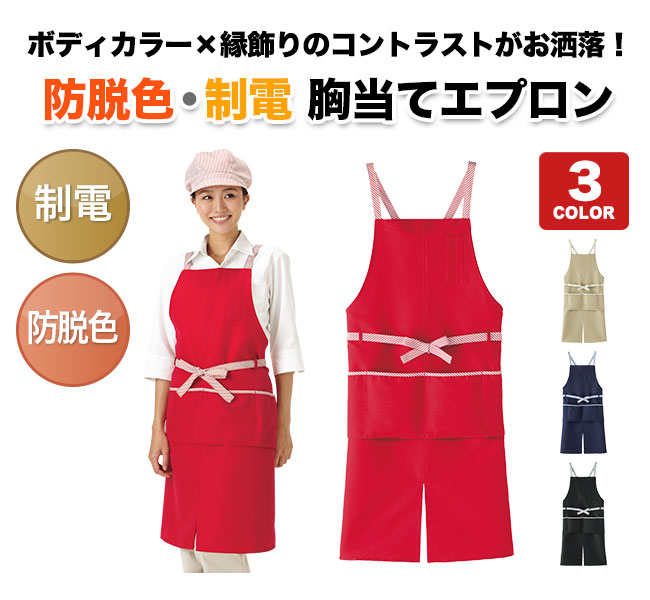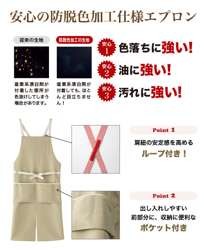 食器を洗う時や掃除するとき、漂白剤や洗剤がはねてしまい色抜け・脱色してしまった! という経験はありませんか?そんな時にも安心してお使い頂ける胸当てエプロンです。