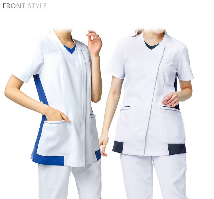 ハードな現場でもテキパキ動ける程よいストレッチ性があり、透けにくい素材で、スナップボタン+ファスナーで着脱が簡単です。脇の配色切替は細く見える効果もあり!