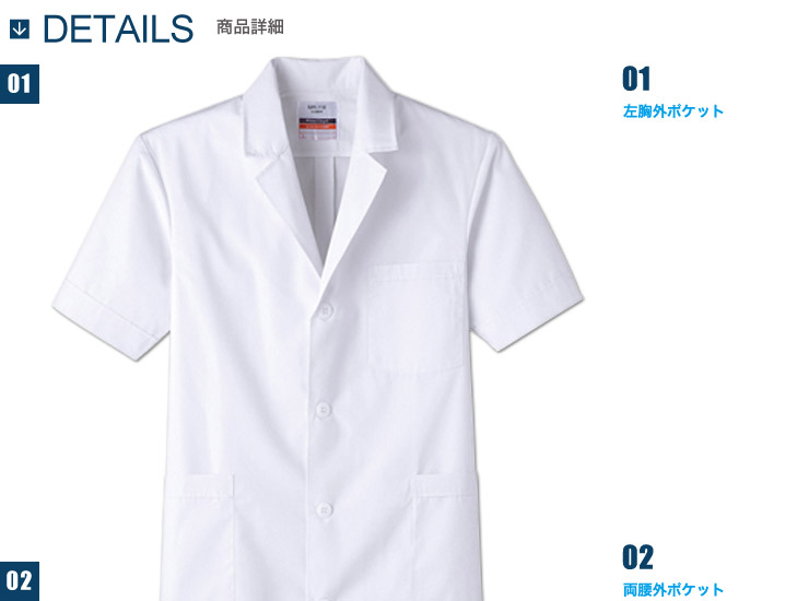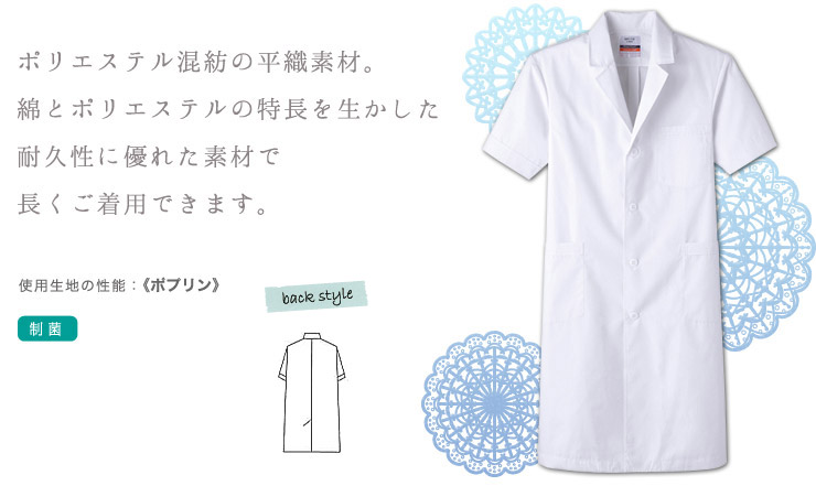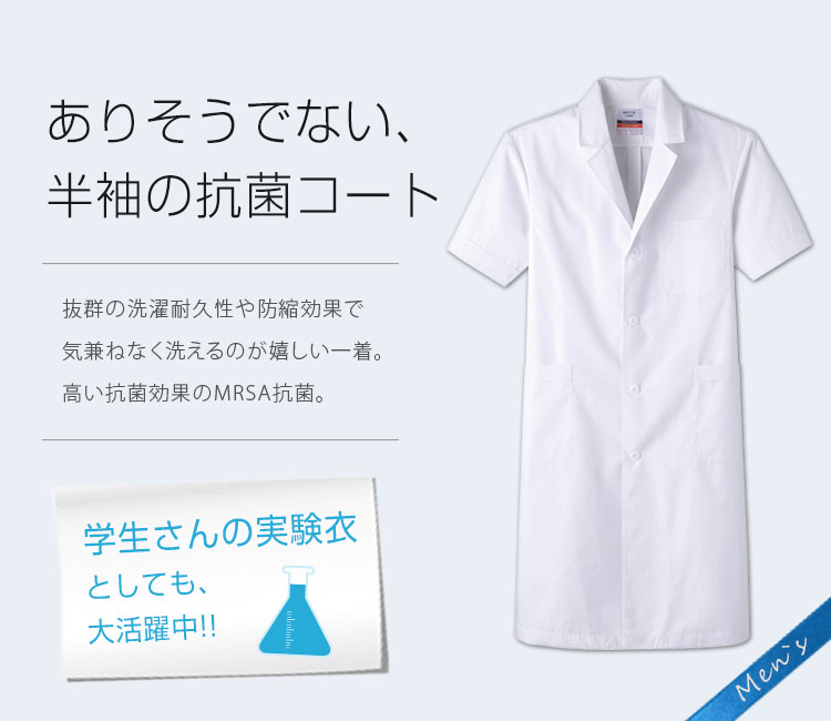 抗菌・防臭効果抜群。学生さんにもお求めやすいリーズナブルなメンズ半袖診察衣。 高い抗菌作用のあるMRSA抗菌ユニフォームです。