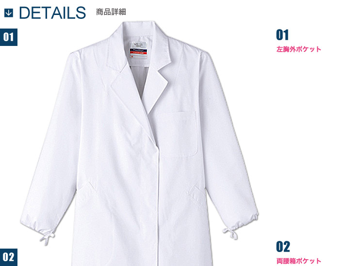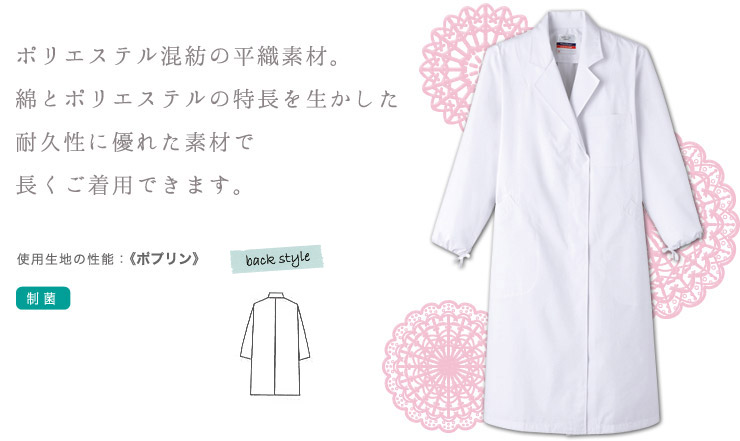 抗菌・防臭効果抜群。学生さんにもお求めやすいリーズナブルなレディース長袖診察衣。 高い抗菌作用のあるMRSA抗菌ユニフォームです。