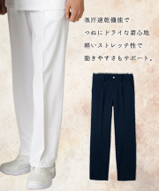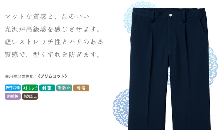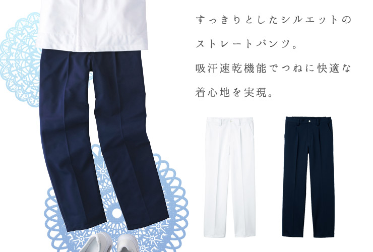 動きやすい素材を使用した、すっきりシルエットのストレートパンツ。
