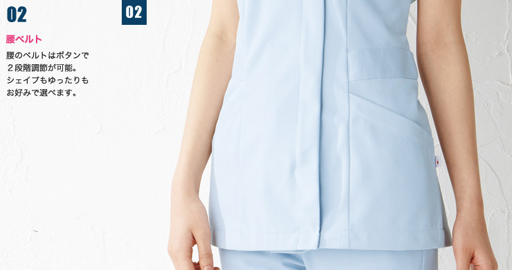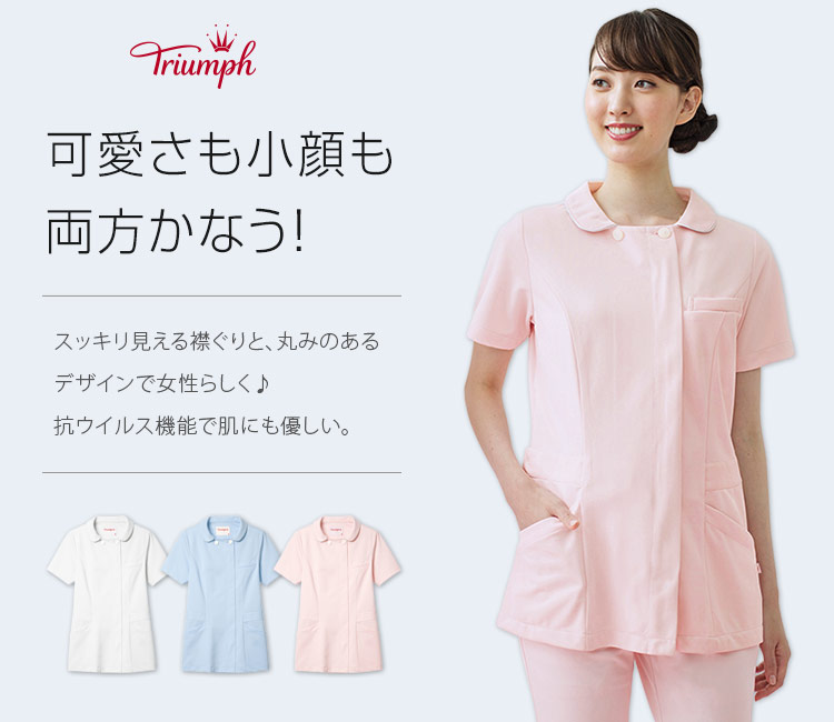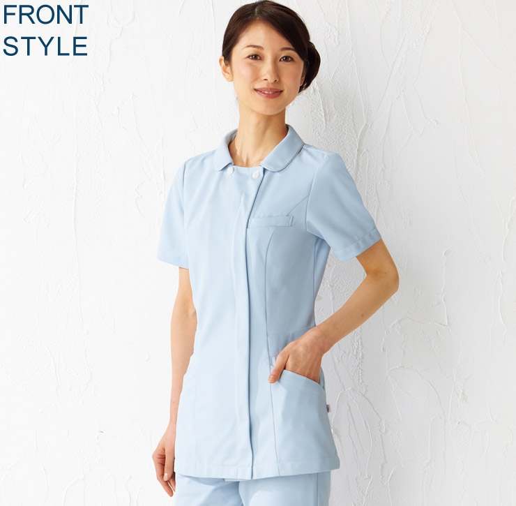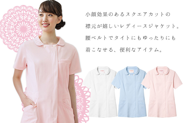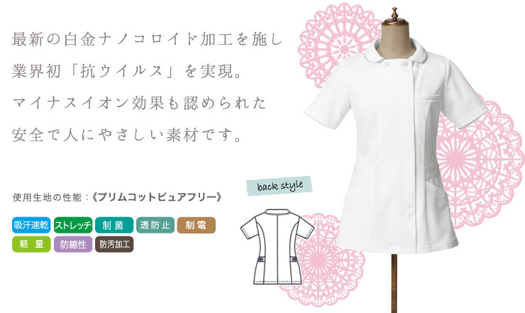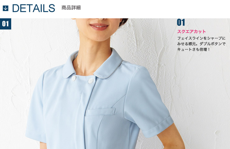 襟元のスクエアカットは、小顔効果抜群。ダブルボタンのデザインでやわらかなイメージも演出します。 業界初の抗ウイルスを実現したプリムコットピュアフリーを使用。安全で人にやさしい素材です。