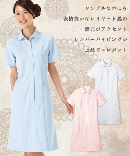 上品な襟元のシルバーパイピングがアクセント。丸みのある重ね襟風のワンピース。
