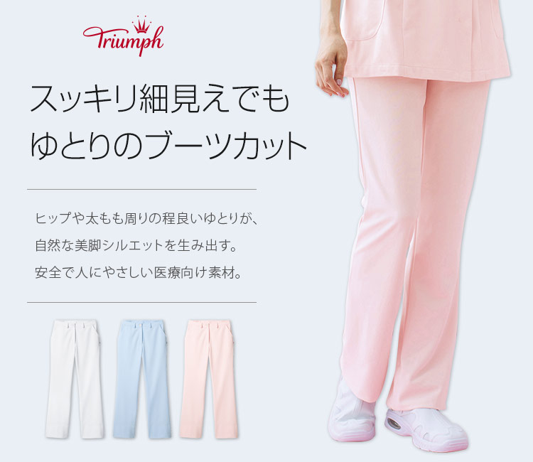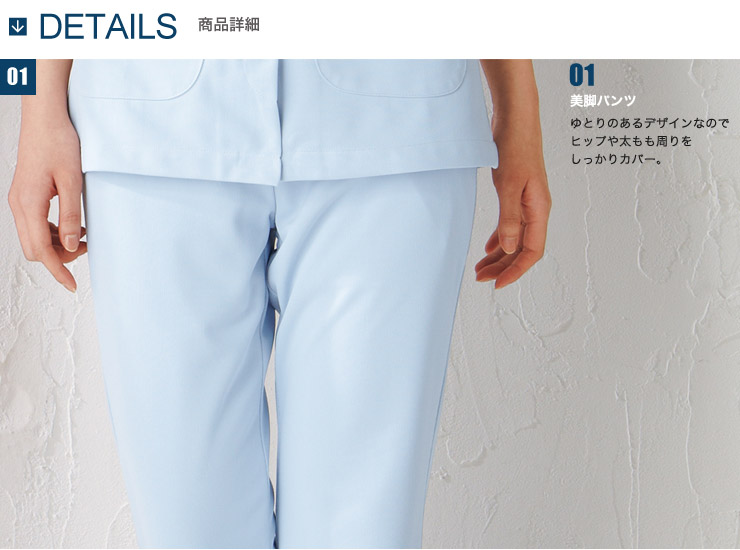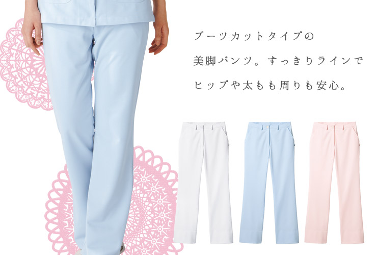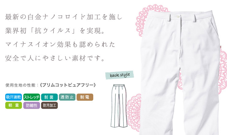 ゆったりしたラインの美脚シルエットのパンツ。ヒップや太もも周りも安心。 業界初の抗ウイルスを実現したプリムコットピュアフリーを使用。安全で人にやさしい素材です。