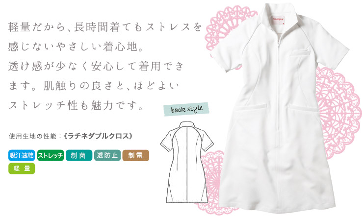 - 吸汗速乾、ストレッチ、制菌、透防止、軽量、制電