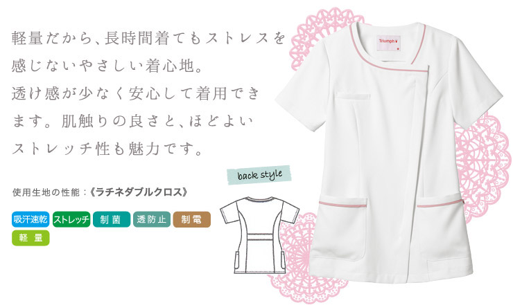 - 吸汗速乾、ストレッチ、制菌、透防止、軽量、制電