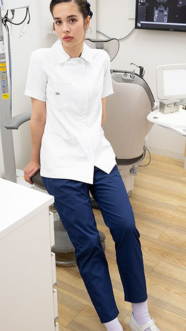 丸みのある襟で、女性らしく可愛い印象。右胸のポケット