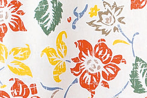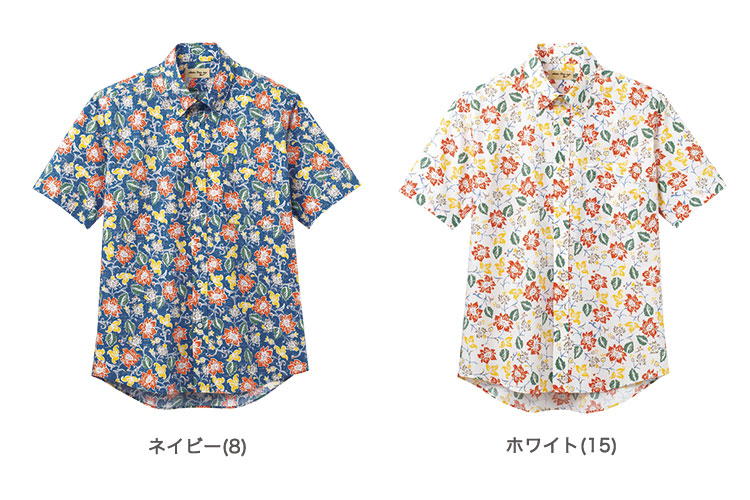 ネイビー、ホワイトに、オレンジ・イエロー・グリーン・ブラウンなど複数のカラーを使用しカラフルで華やかな印象のアロハシャツ。明るく元気な印象を与えます。