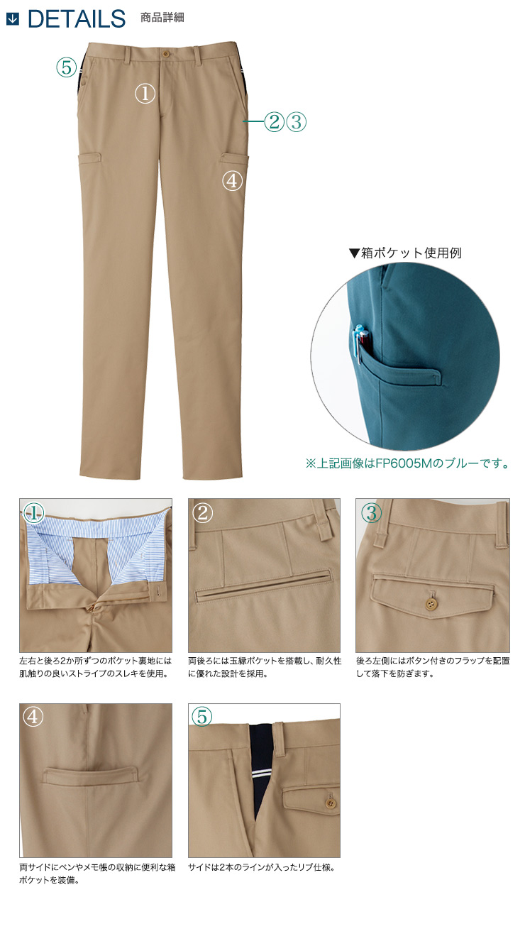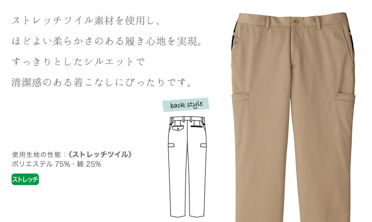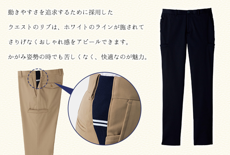 ウエストの脇部分はリブ仕様でフィット感抜群! ストレッチ性にも優れているので動きやすく、アクティブな作業でも安心の履き心地。 リブのさりげないラインにこだわりを感じる、メンズチノパンツ。