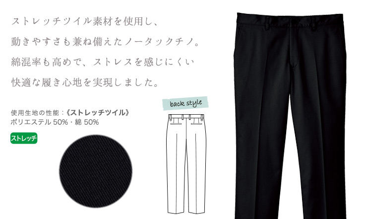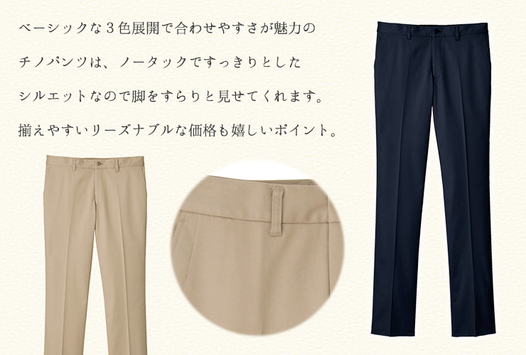 ノータックのレギュラーシルエットのメンズチノパンツ。 ストレッチ素材で動きやすく、実用性に優れた機能も充実。 シンプルでトップスを選ばない履きやすさが魅力。