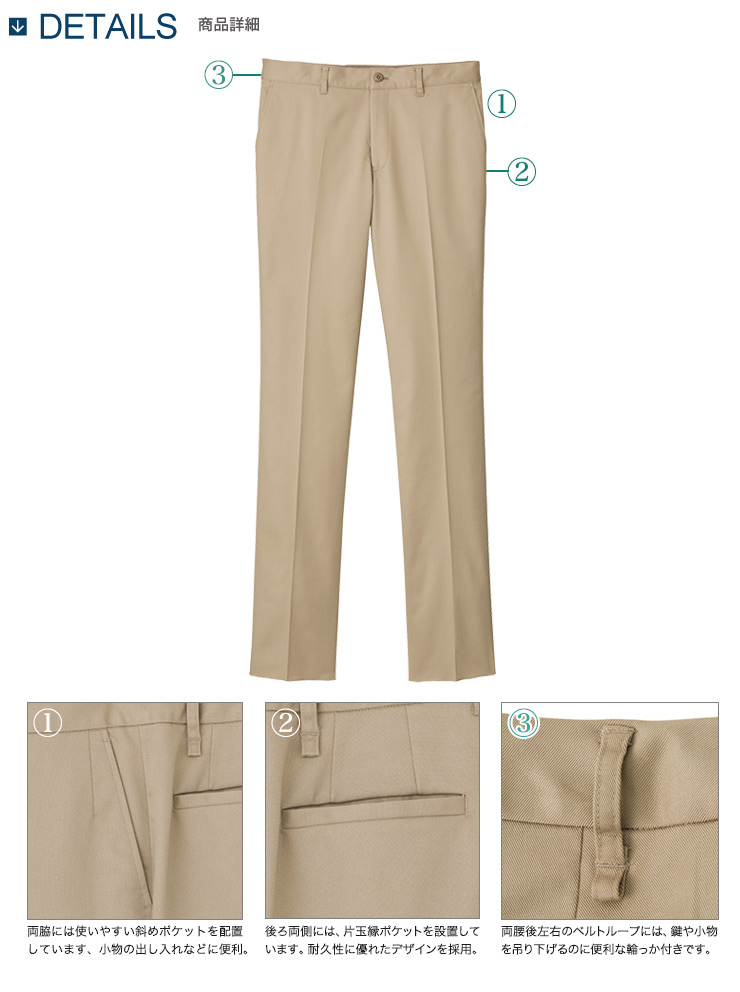- 両腰斜めポケット、後ろ両側片玉縁ポケット、ベルトループ後ろ左右輪っか付き