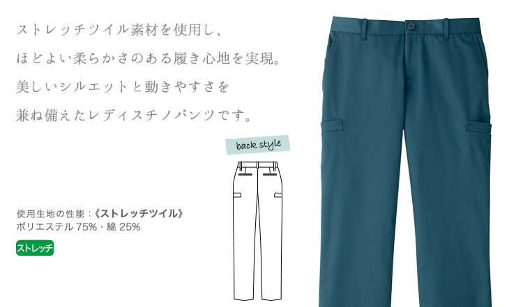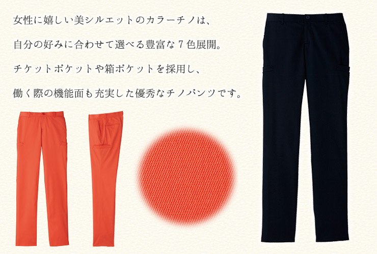 ストレッチ素材で動きやすいレディースチノパンツ。 鮮やかなビタミンカラーで気分を明るくしてくれるカラバリも魅力。 多機能ポケットで履いた時の利便性も考えられたパンツです。