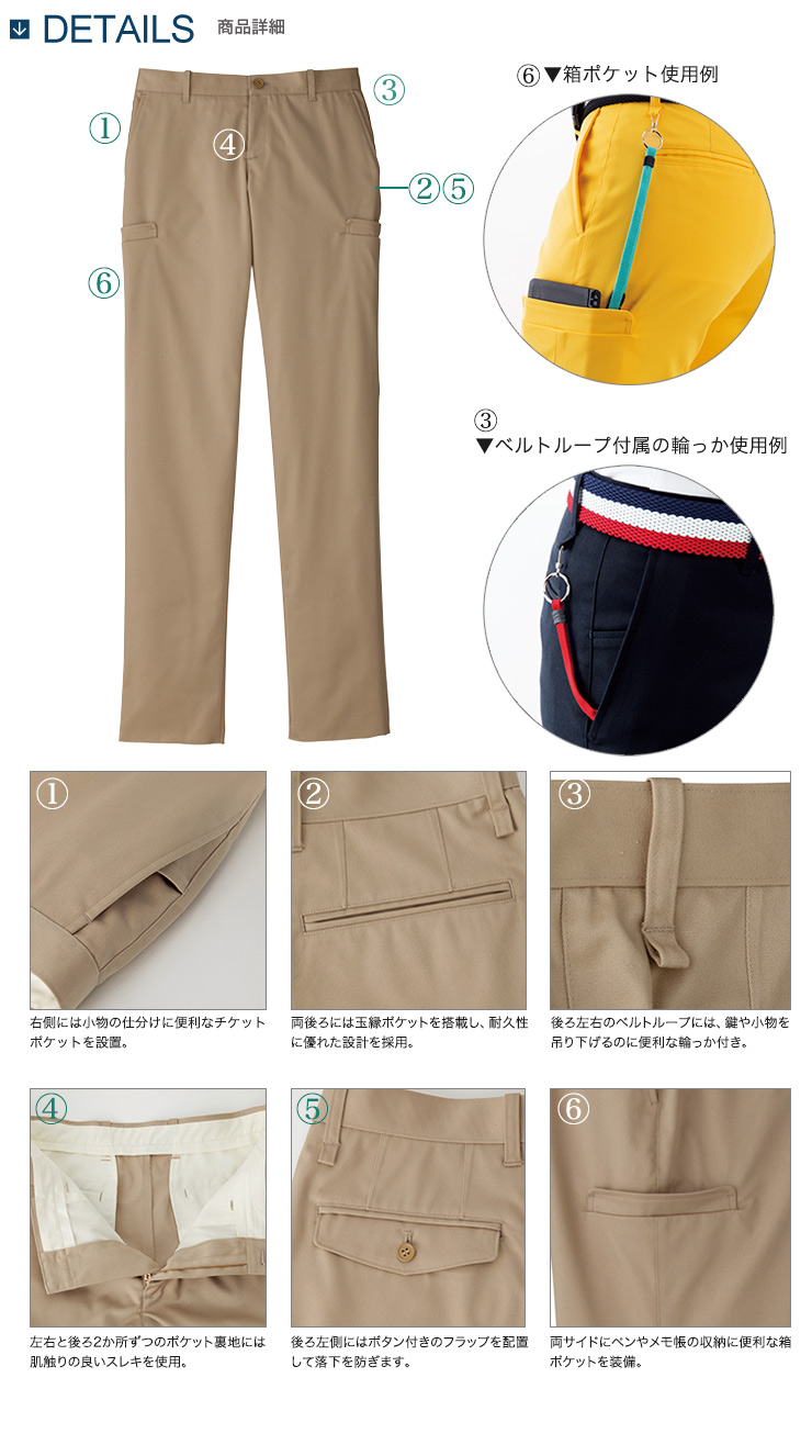- 両腰斜めポケット、右側チケットポケット、両脇箱ポケット、後ろ両側両玉縁ポケット、ベルトループ後ろ左右輪っか付き