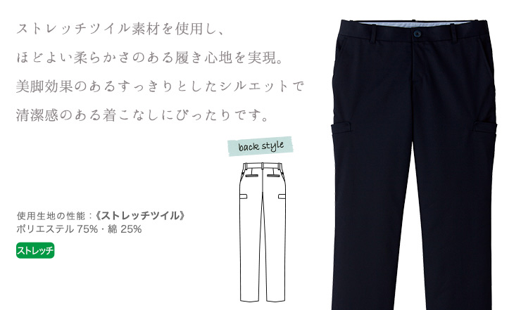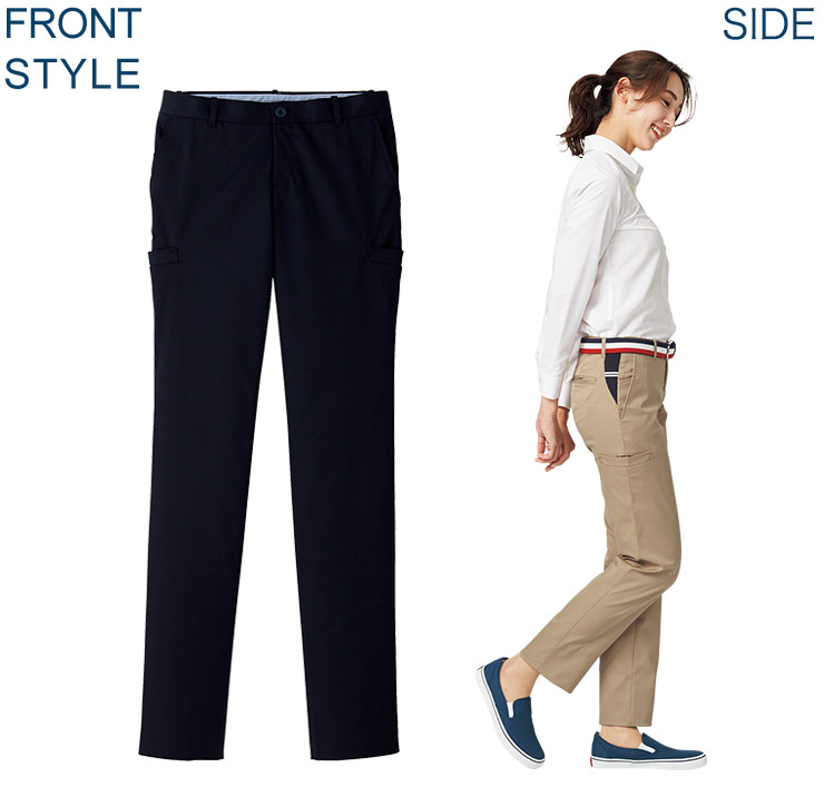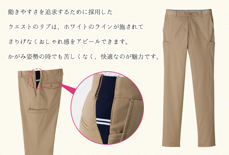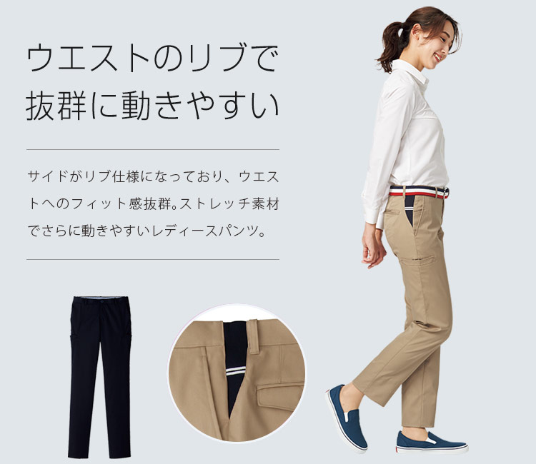 ウエストの脇部分はリブ仕様でフィット感抜群! ストレッチ性にも優れているので動きやすく、アクティブな作業でも安心の履き心地。 美脚シルエットが魅力のレディスチノパンツ。