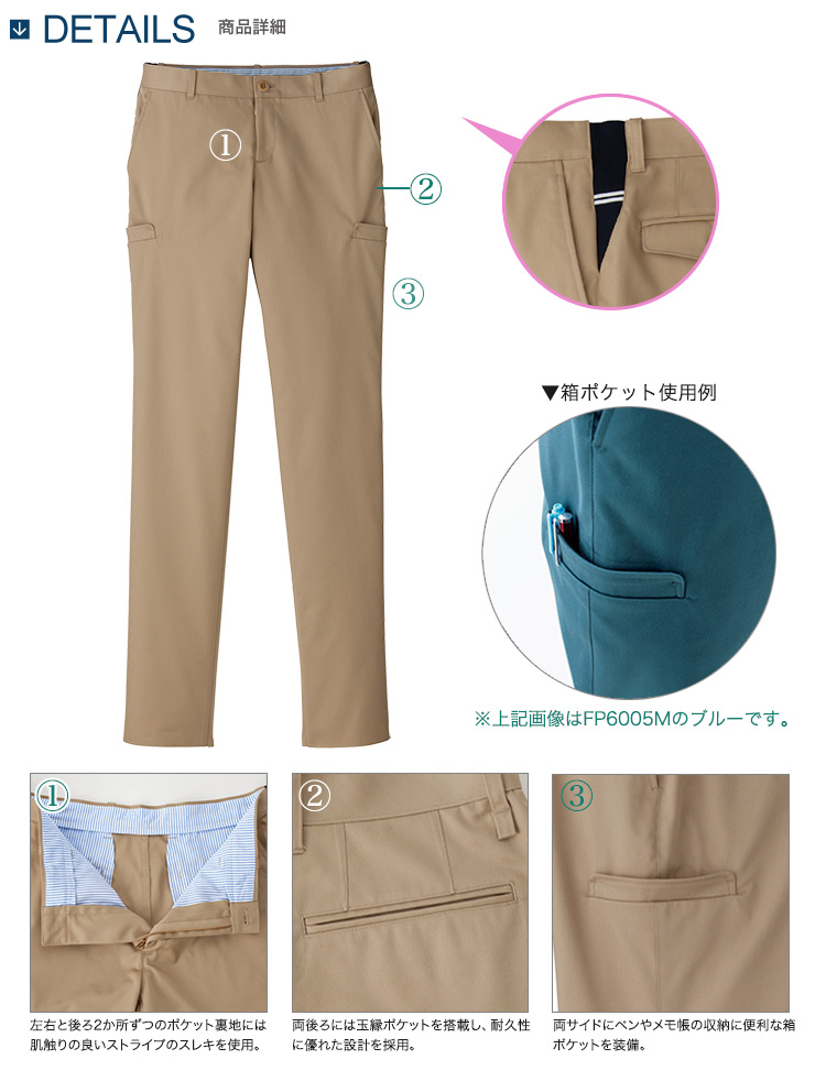 - 両腰斜めポケット、右側チケットポケット、両脇箱ポケット、後ろ両側両玉縁ポケット、後脇ウエストリブ仕様