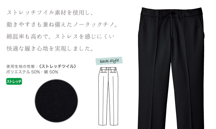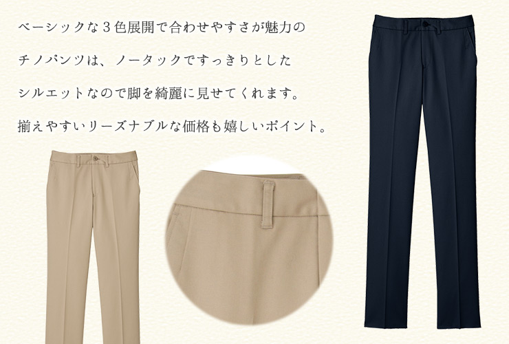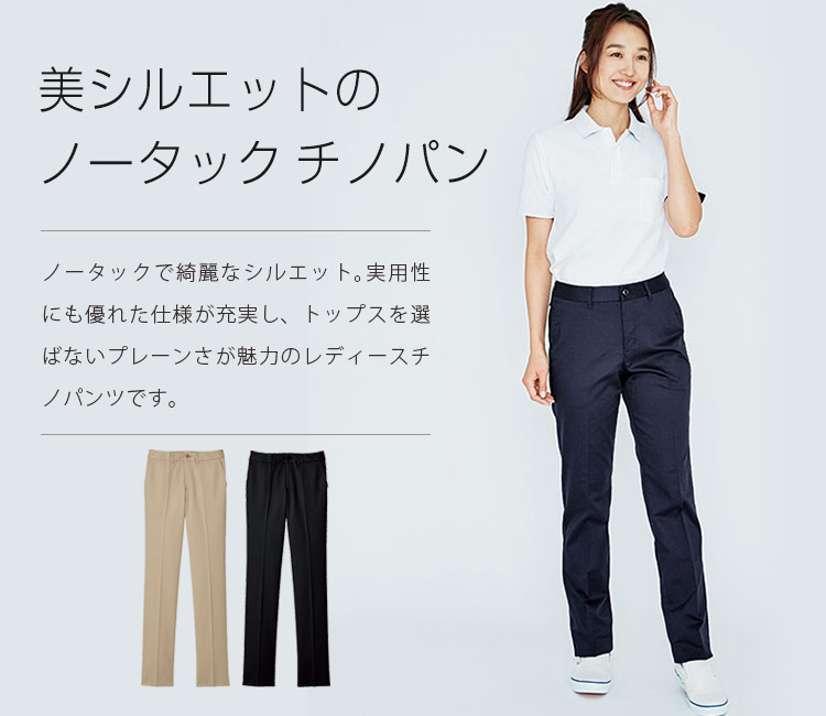 ノータックでシルエットの綺麗なレディスチノパンツ。 ストレッチ素材で動きやすく、実用性に優れた機能も充実。 スタンダードなカラー展開でトップスを選びません。